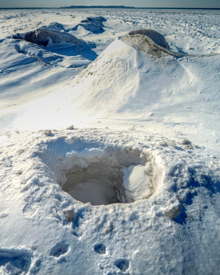 Happy to see all the smog was on the Canadian side! Just kidding. I've never seen an Ice volcano before, but they are pretty cool. The image you have given us does need the tracks in the snow to give a perspective of the volcanoes' size. Well done.
