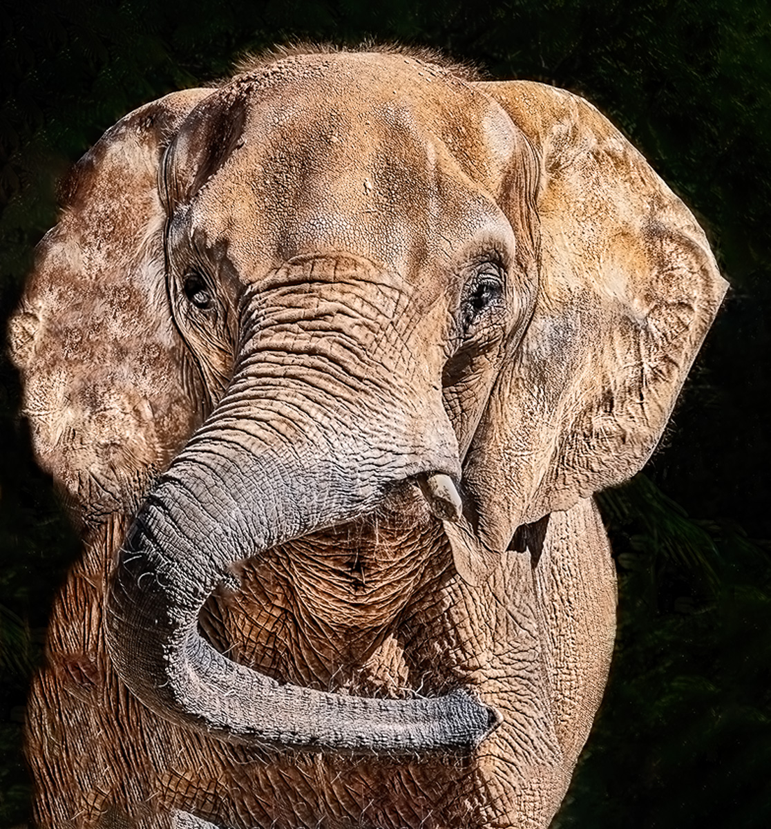The image is well exposed, and sharp. Color looks spot on too. The curve of his trunk is appealing and incredibly unique. I can't make out where his mouth might be. I also am experiencing some eeriness with the eyes and texture. The closely cropped composition is not appealing to me.