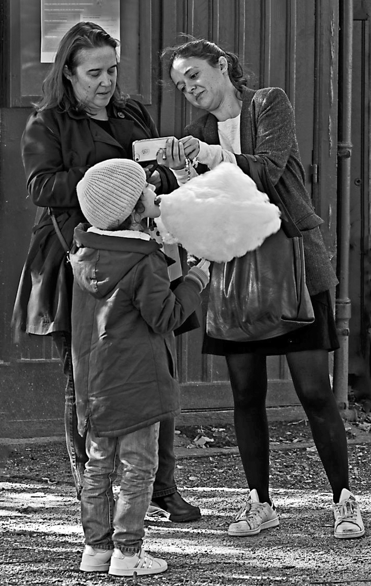 Welcome to DD23, Richard. Make sure to send Brian your Bio image. The image is sharp, nice colors and well exposed. You have two issues IMHO with the image. You have four people that are not engaged with each other. Two looking at a phone, one eating spun sugar and one rummaging through her purse. I don't see a story anywhere in the composition unless it is that people don't engage with each other here in Luxembourg Gardens. Your camera work is excellent, and it looks great in B&W too. |