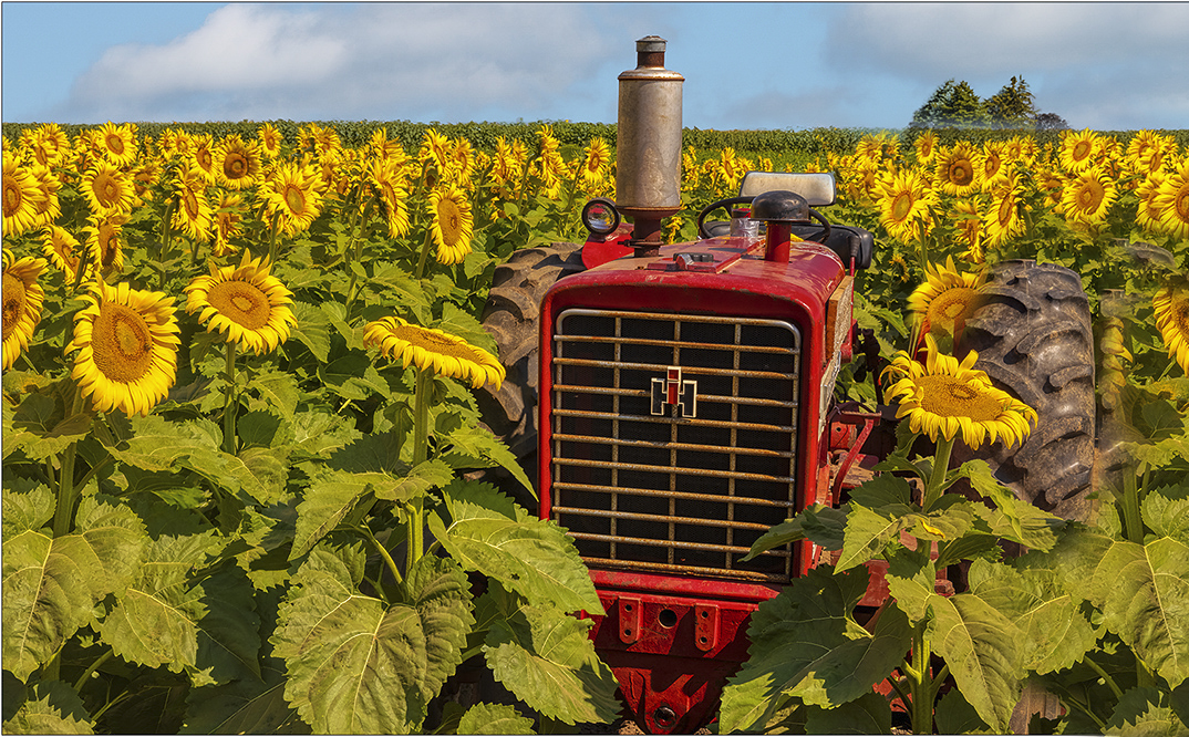 I really think you did a great job editing the image. Midwestern dream to ride an IH or JD tractor. Either red or green would have worked, but red is preferable because of all the leaves. I did a quick edit, selecting the left side, copying as a layer, flip horizontal and then masked it in. I used selective color in PSCC to get the colors a little closer to what I remember but messed up the mask by hiding the wheel cover. Terrific image. |