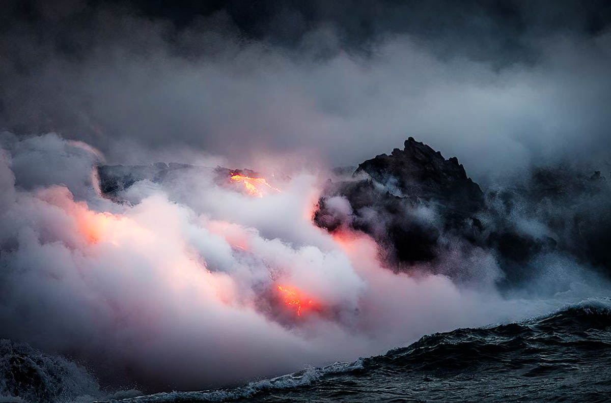 I really like this series. Kilauea was flowing the last time we went to the Big Island, but we couldn't get near it. It is a marvelous site watching the lava spew forth. Your colors look realistic to my eyes, but realism is always in the eyes of the beholder. Even though I know your vision included a darker, dramatic look, I think the blackness is too much in this case. I added a little more light and this version is what I saw from much farther away. Hard to believe it has been continuously flowing for 30 years now. |