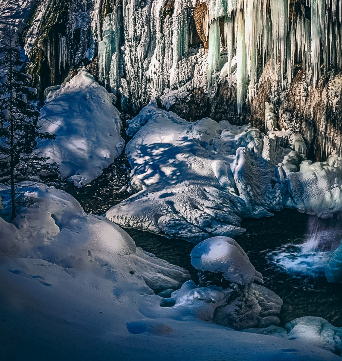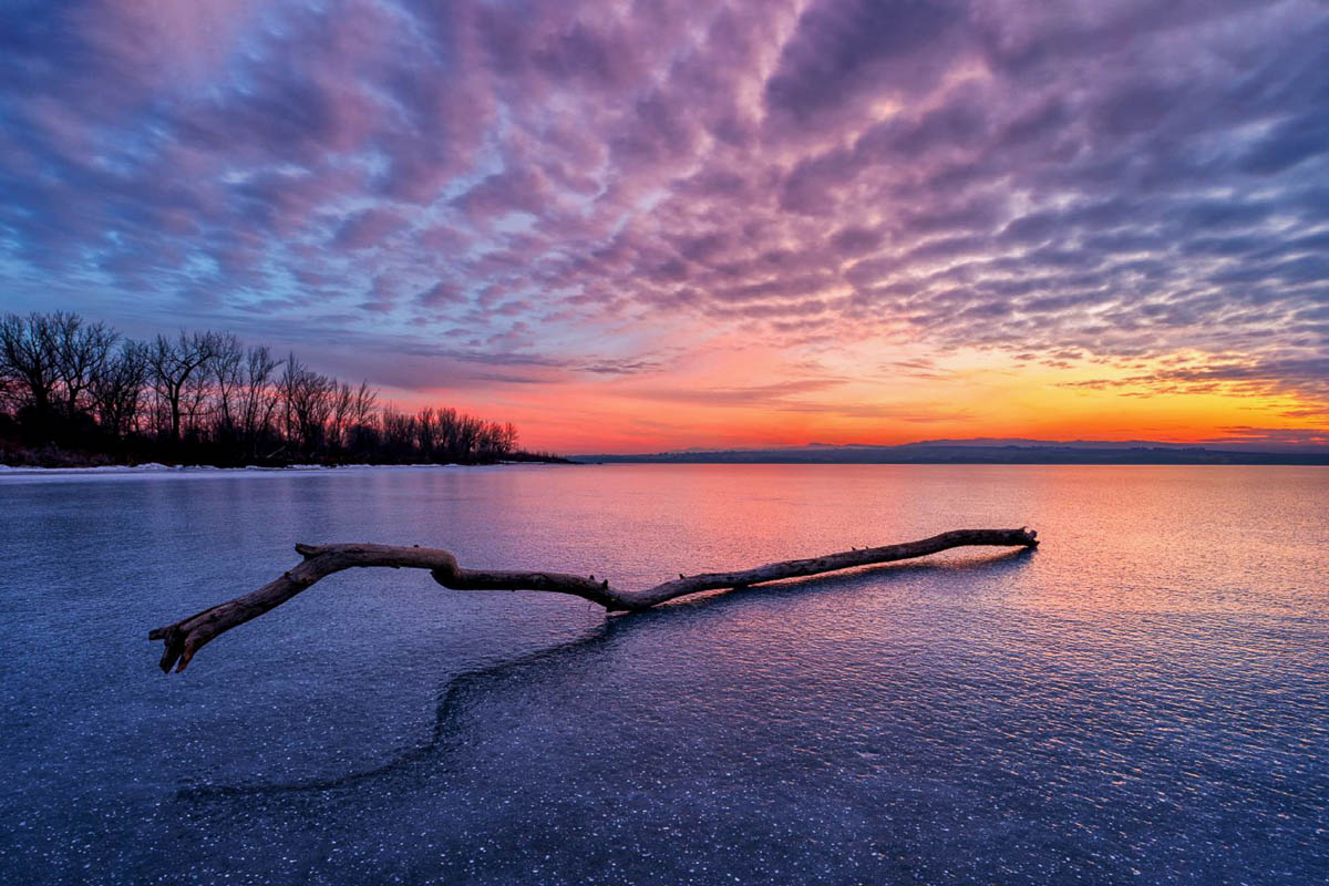 I keep coming back here, and now I see a different image than at first. The branch that is out of the ice, and it's shadow make an animal head I didn't see first time around. I used the brush tool to darken it about 25 per cent and keeping your 4x6 crop I cropped some from the left bank, right side and used content aware to increase the sky. I couldn't tell the white spots in the lake are bubbles, but I also thought the bottom was too much. Your vision though. |