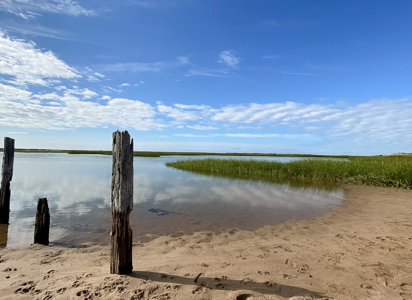 I like the composition a lot. Like Dan said, a tighter crop might help. You have several S-curves in the water I would keep. My crop was too tight to the third post, but I couldn't successfully clone out whatever that triangle is behind it. Looks like it could be an artifact from a clone clean up.