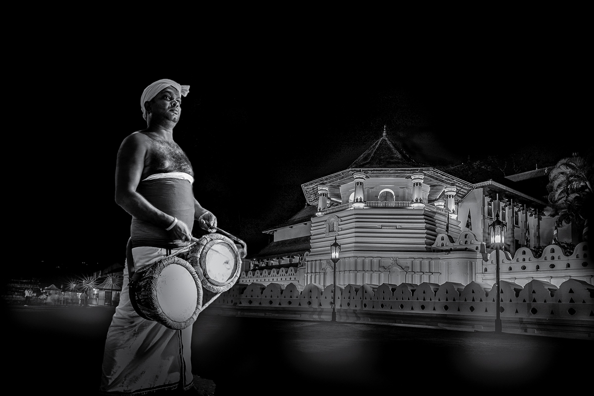 I really like this composition. Sam. I can relate to your vision and your image has a lot of emotion. You decided to leave a hint of more roof to the temple, and I understand that the subject is the drummer. I would consider burning the roofline and the trees to simplify the image or increasing the shadows to reveal the temple more but push it back. It already captures the eye first as the drummer is darker. I removed the lights on the left too. I found them only slightly distracting. Great image. |