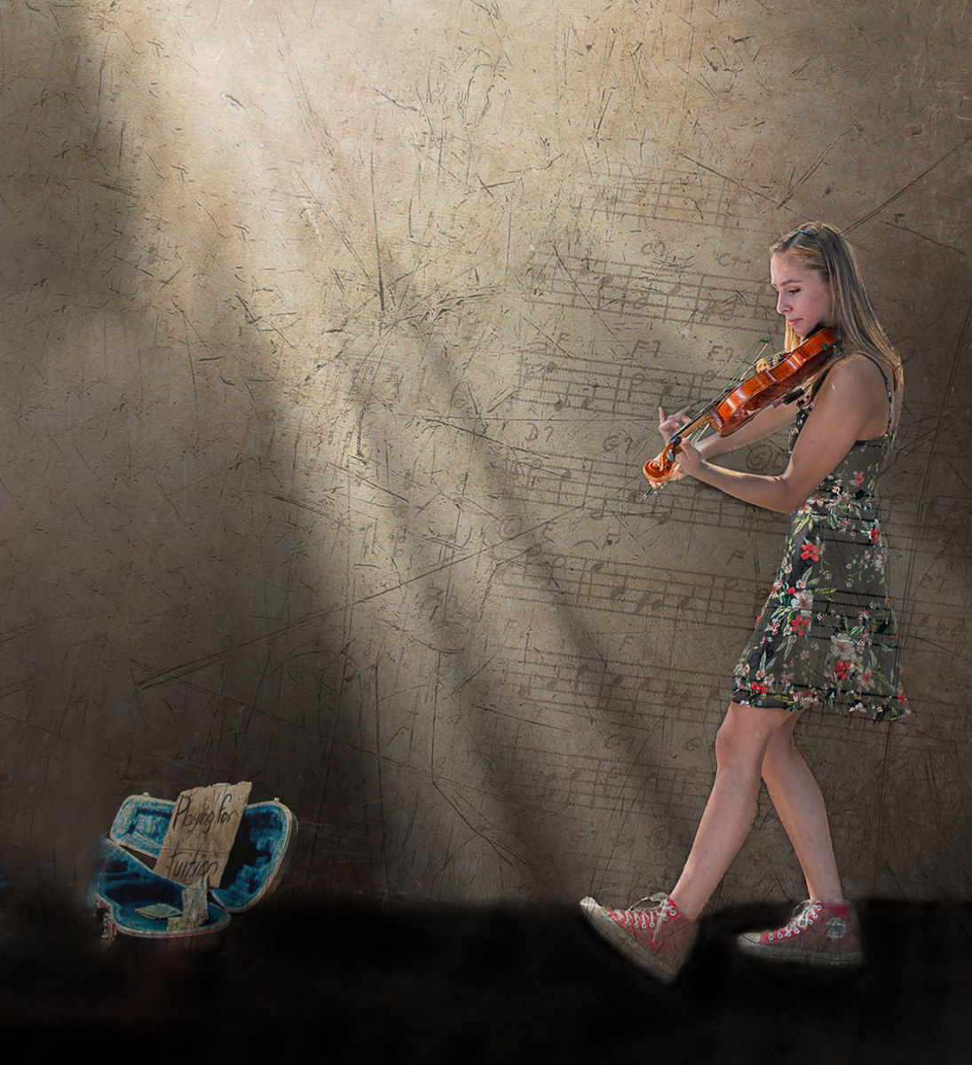 Thanks for sharing, Fred. Your background change makes a busy image beautiful. I agree with Sam that making the horizontal level helps the viewer. I used PS and had some trouble with the case, but you get the idea. I would consider leaving the music stand in also to give reference for the open case. Really well done. |