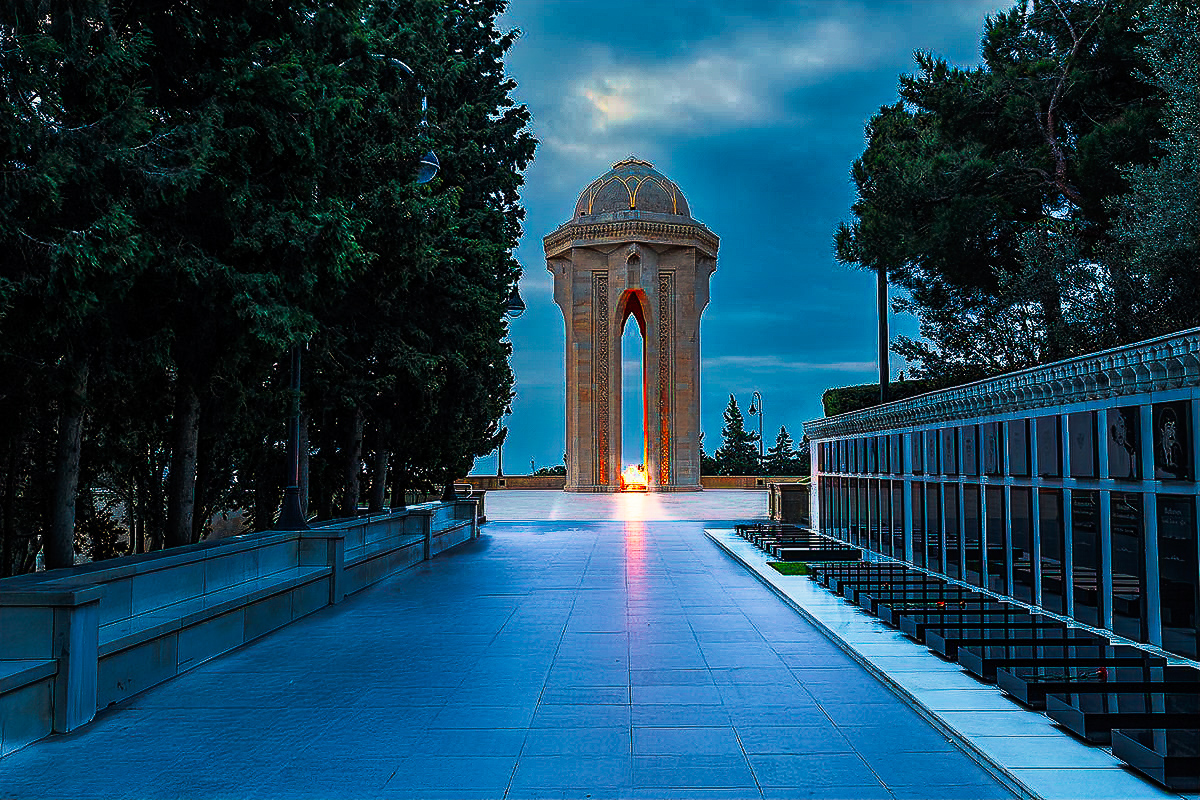 It isn't clear to me that the light is the sun, or that the right side is Azerbaijan's Martyrs' Lane. I would consider this more of a documentary image, than a competitive image.