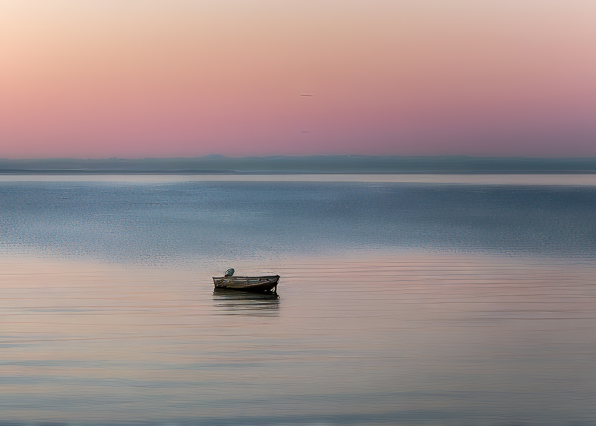 Beautiful image, but very noisy. Probably could be shot at 400 to 800 ISO now, but it is worth working on. It sort of looks like this may have been a quite large crop. I added a gaussian blur to the image and took some of the noise out, but it isn't as easy as denoise on a RAW file. Topaz Denoise is a great plugin. I masked the boat to keep the detail and darkened it a bit. I also removed the far boat and birds that looked more like spots, as Haru mentioned. Good work.