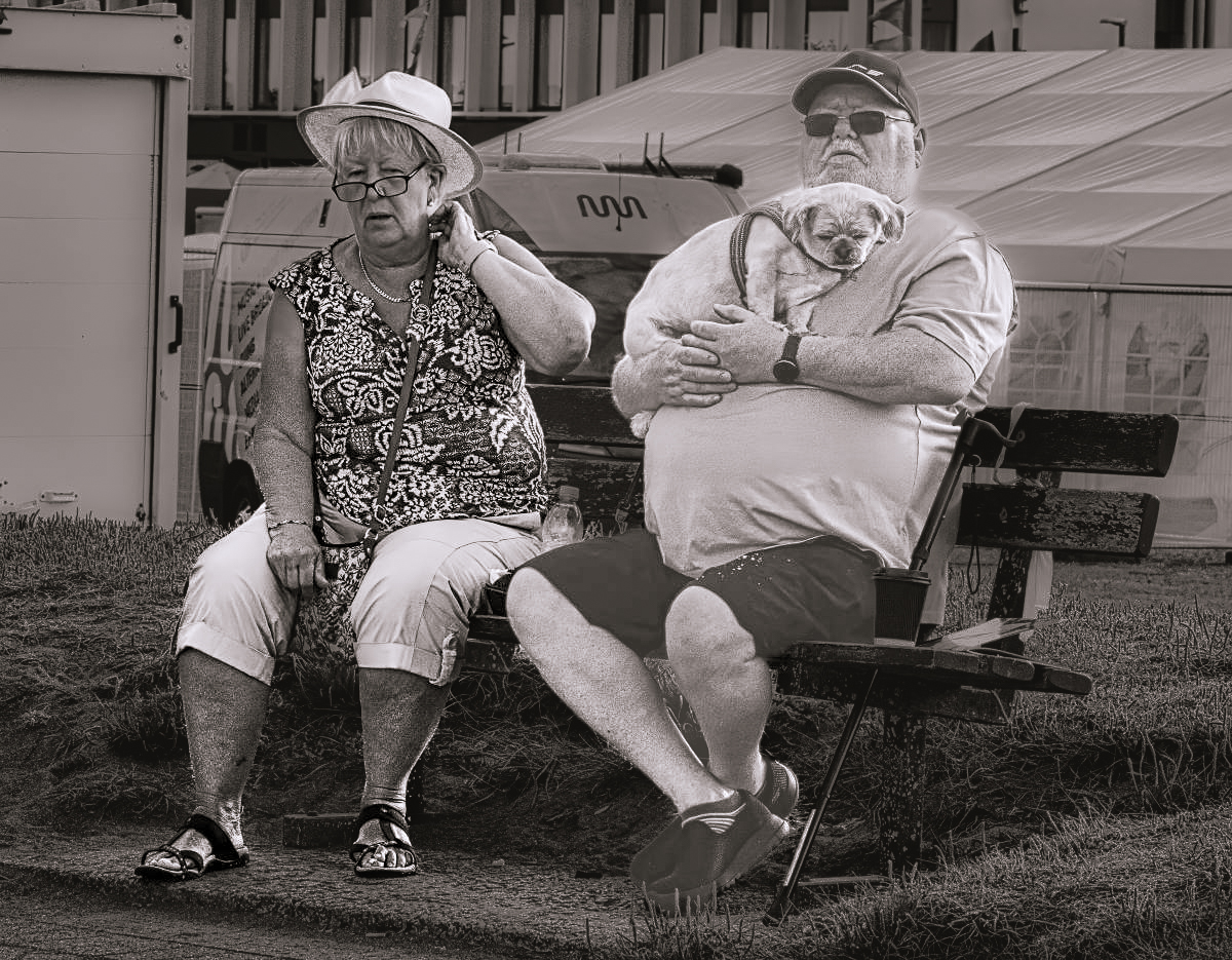 Hi Tim, I like the subjects, and their expressions are great. They look beat. My story is that he is retired from the military, USAF, but his hat is tilted back so I get to make my own guess. The spoiled little pooch gets a nice soft seat, while the wife fends for herself and her camera.