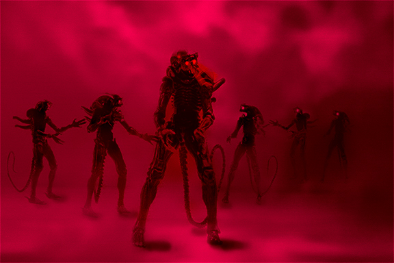 Hi Angela, your image evokes an eerie, otherworldly feeling, and is very well done. Red is a good color choice for aggression. I love the progressive size of the aliens, and their wedge/vee spacing. Evokes memories of my military training. My only concern is the brightness coming out about the center figures eyes. I think the eyes would show better if that area were darker. I added a couple of masks in LR to try to add more depth. Great project! |