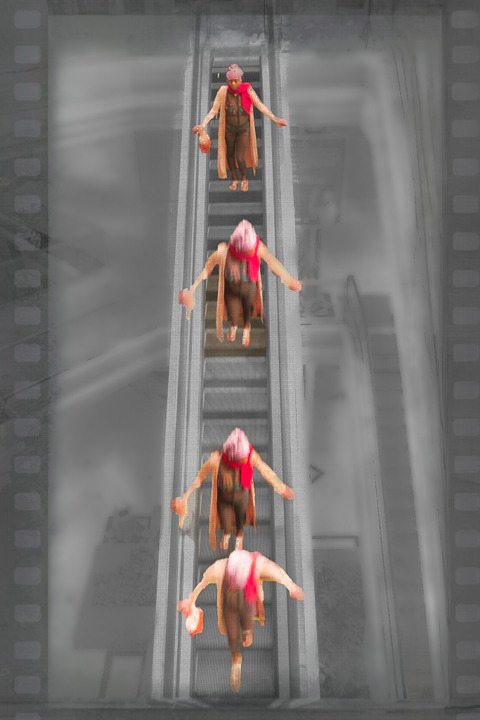 Hi Sylvia. What a very clever idea. The motion adds some interest too. I'm not sure if the texture and border help though. The up escalator merges with the border and the lower floor is busy, which I assume made it turn into a B&W. The woman's third position might work better if a little higher. You can drag rulers in PS to help position objects. I can't remove a texture, but I tried to keep the border, and did some object masking in LR to give you some idea of what could be consider for a terrific idea. |