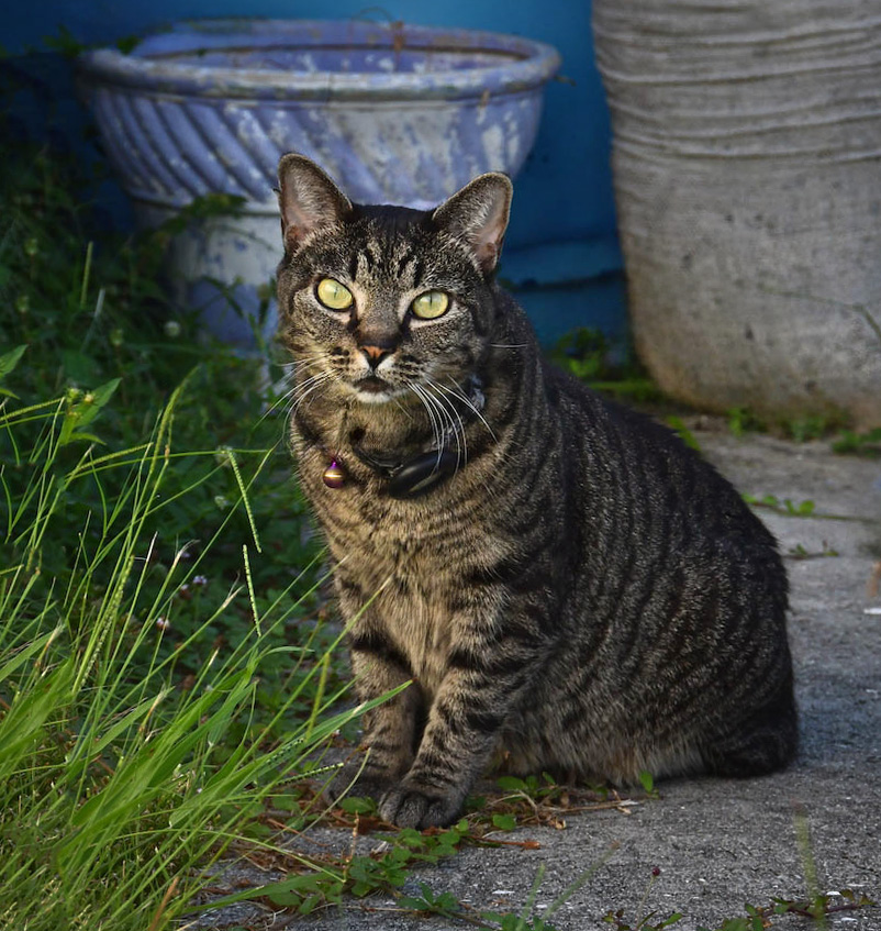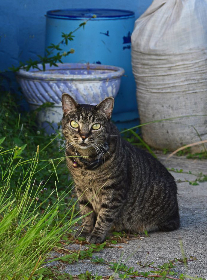 Hi Kathy, This is a very cool cat shot. The background is amazing. Colors are nicely brightened, and it is amazing the cat was curious enough to stick around for a portrait. Eyes are mice and sharp for me. I had a cat named Mika that was a tabby, and died of old age.