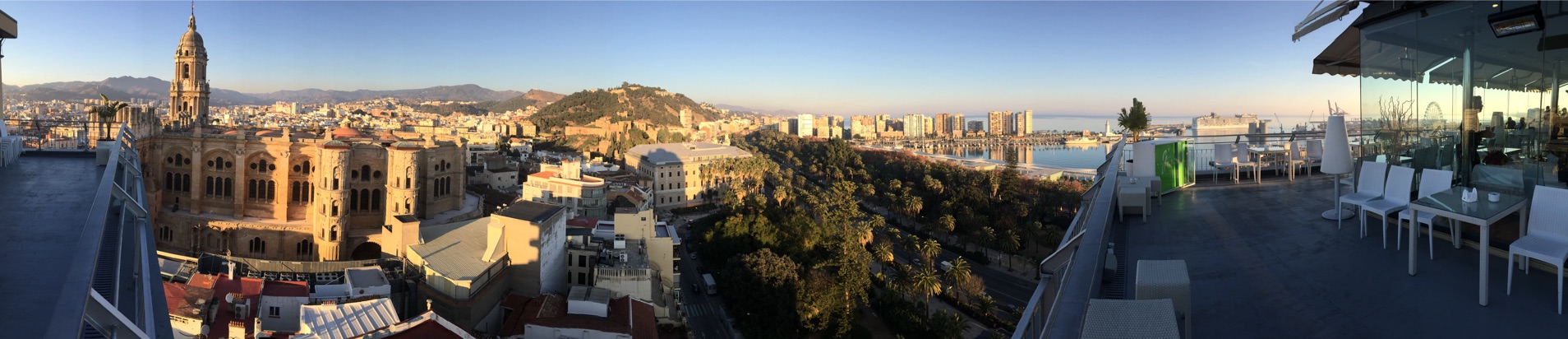 I'm attaching a panorama I took from that rooftop in Malaga in 2015. You can see it's a good location for your effect, though my picture doesn't do much. Rooftop of the Hotel Malaga Palacio. |