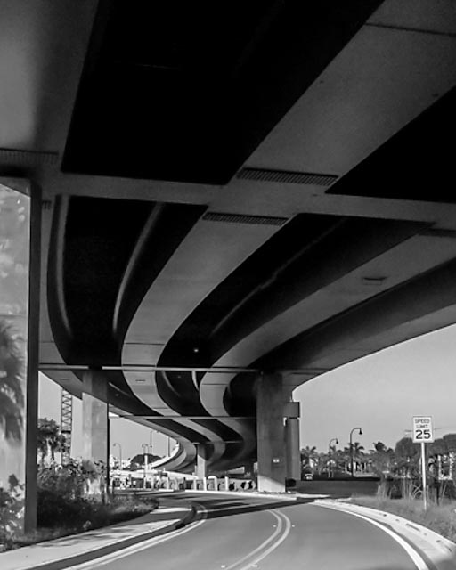 Judy I like your revised version better. How did it do at your photo club? A couple of suggestions from me: 1. clone out the light spot top center (dust? part of the bridge?). Using an 8 x 10 constraint, I cropped closer, eliminating most sof the sky areas and reducing the lower roadway. For me, that further enhances the curves of the overpass. Just a suggestion. |