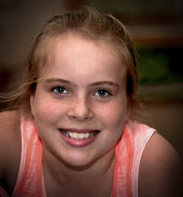 I definitely like the natural expression on her face as she looks up. I agree with Judy about some of the changes she suggested, but I would not crop quite as severely. I cleaned up a couple of small things in PS, e.g. removed a stray hair from her forehead, that sort of thing. Then I took it into OnOne Portrait where I added a little more detail and brightness to the eyes, whitened the teeth very slightly, removed some shine off her forehead. My example is attached. I also added a slight vignette and removed the white line in the background. |