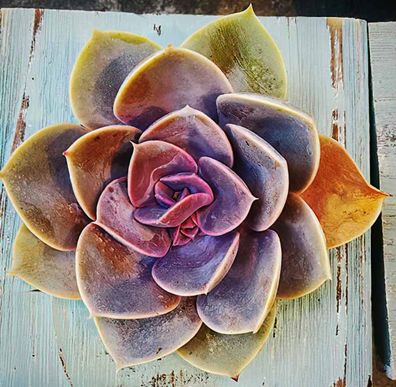 I like your subject very much, especially like the texture and color of the background board. I took the liberty to play around with the image. First I reduced the luminance and exposure as it felt too bright as it appeared on my monitor. I cropped the bottom and left side as I feel the background should just include the green board. I did not take the time, but you could remove the brown background from the top as well by replacing it. Removed the green stem and a small brown leaf from the top. |