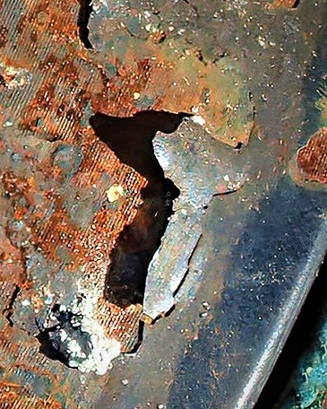 I enjoy abstracts such as this. I wonder what attracted you to this specific one? Was it the color? textures, lighting? I decided that for me, the hole and the blues are the appeal. I cropped, adjusted the light and colors to draw attention to what appealed to me the most. |