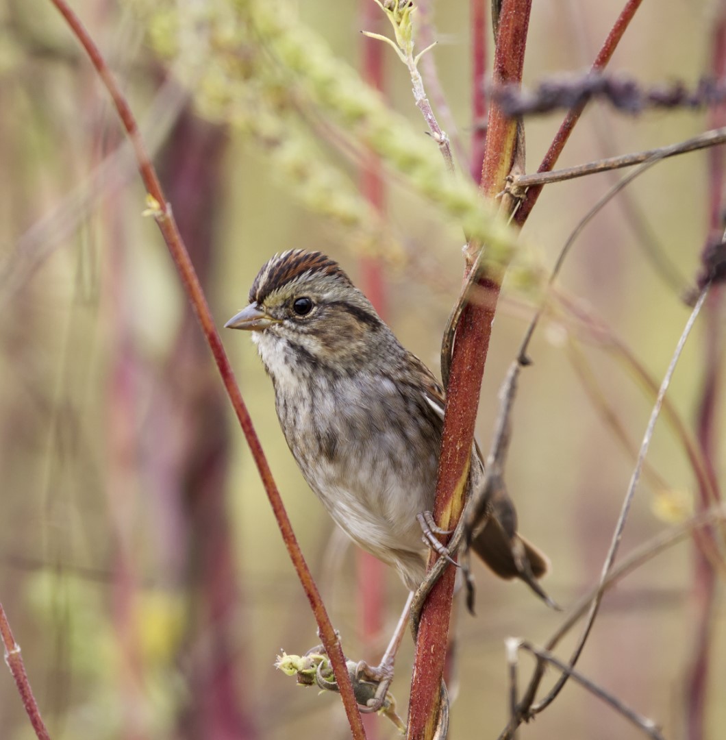 Good capture of this little sparrow in his habitat. I especially like his position on the twig. I understand why you chose to keep the space on the left, but I would prefer a closer crop. With a closer crop we have a better view of the sparrow and enough environment as well. Just one person's opinion. |