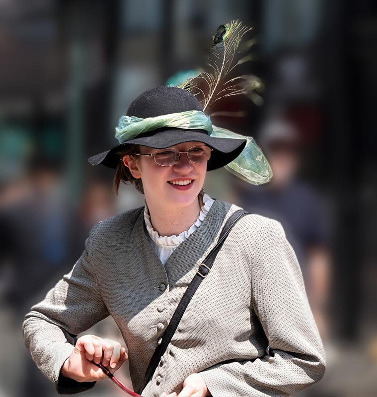Good pose and good expression on the Irish lass. I felt the background had some distractions which I removed. Then I put an additional blur on the background, and reduced the hilites on the ribbon extending from her hat. |