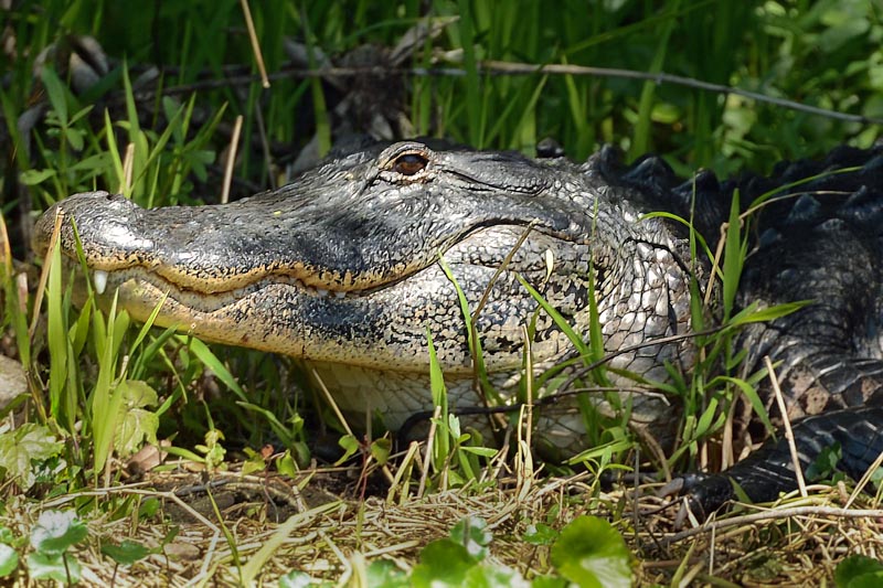 Nice position of the gator in its natural habitat. I took the liberty to make a couple of changes. First, in Topaz, I sharpened the subject as his eye and face seemed soft. Then I removed the long bright piece of grass on the left and also one small piece that intersected with its snout. Finally, I darkened the foreground grass, added a very subtle blur to the background. |