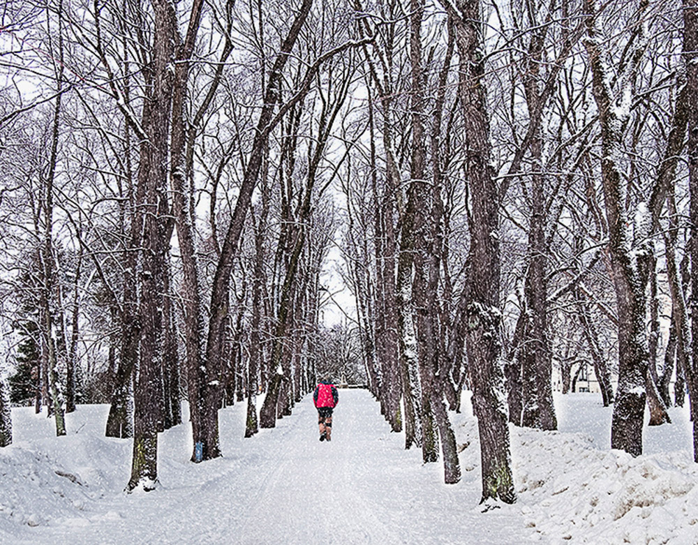 A lovely snow scene, although I agree that it is a little noisy. I increased the contrast a little, changed the crop to remove the person from the center while at the same time removing the tire tracks. Just a suggestion, you may or may not like. |