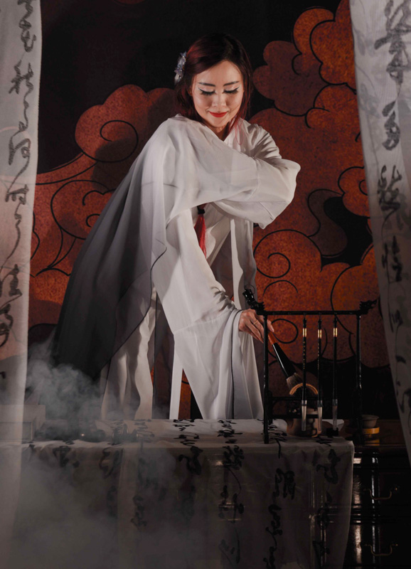I love the expression on the model's face. The red/black background plus the white drapes provide a pleasing background. I do agree with the others however. In my example I have increased the exposure a little and cropped from both top and bottom. Example attached. I did not take the time to remove the stray hair shadows from her face but would recommend that as well. |