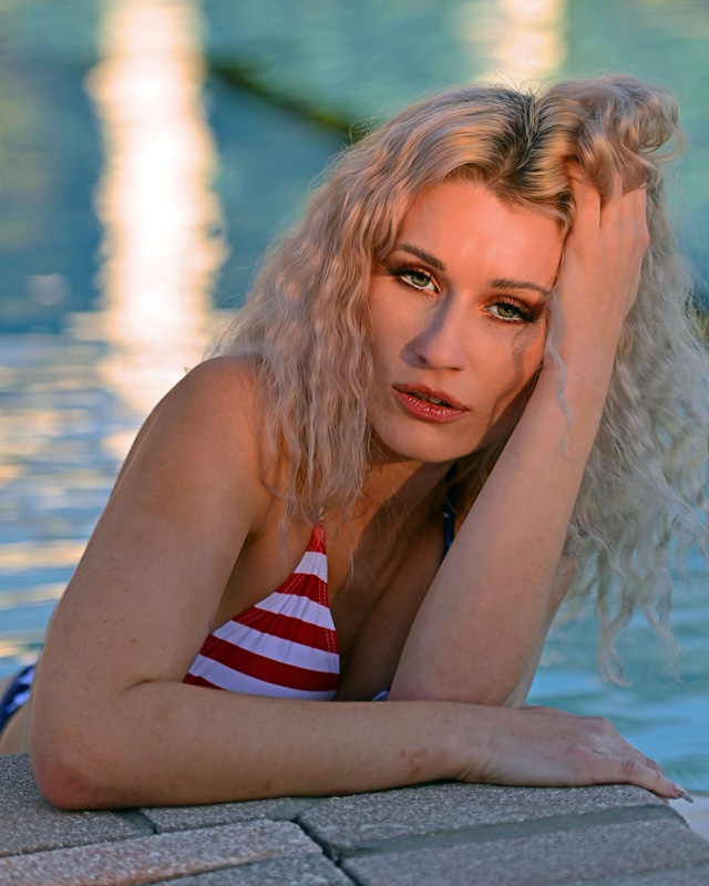 Similar to Walter's image, I changed this crop to an 8x10 to eliminate some of the bright reflections above the model. I don't dislike the reflections over all but found some of them to be distracting. I would also recommend removing the green line in the pool and possibly the hair and shadow of the hair on her face. Otherwise I like the lighting on her face and her expression. |