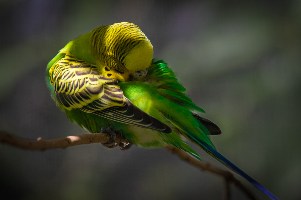 Marge, you've broken at least three compositional rules and for the most part, you've can justify them all. It's been said that if you miss the eye, you miss the shot. Not in this case. Your camera work is spot on but as you can see from my suggestions, everyone has a different eye for how this image can grow. I know your emotion was a major factor of this image. Show me a horse image and I'll wax nostalgic every time. When I post process I like to take advantage of natural compositional "rules". Subject is everything. So I want that to draw your eyes. Light, or the lack there of, is a primary tool. So I darkened the wonderful bokeh behind the bird. I boosted the exposure and saturation of the bird and also boosted the contrast. Dappled light is normally a no-no but with the de-emphasis of the bokeh, it works here. I also cropped from the upper right to balance the image and put the bird on an emphasized diagonal. Finally, I added a slight vignette. I enjoyed your image and think you did your memories and the parakeet justice. Well done. |