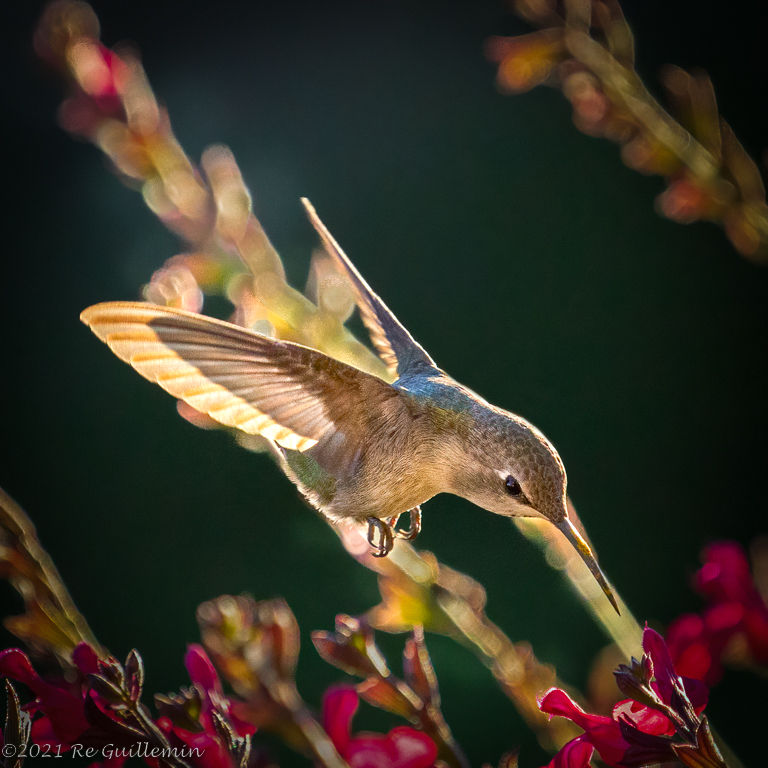 I think you did a marvelous job in post and I think you had a good plan to capture such an elusive subject. In my opinion a good Hummer capture is about 25% planning and 75% luck. Without staging a shot (don't know how you would do that) you get what you can for a background, in my opinion. I love the side lighting and the bonus is the wing shadow on the other wing. I used the "subject" filter in the new Lightroom to isolate the background and reduced exposure and highlights. I also used a brush to further darken the brighter spots of the whole image. Another brush added dodging and contrast to the hummer. I then added a vignette to further isolate the bird. Personally, I prefer a slower shutter speed that can give a sense of some movement of the birds wing tips. There are two times when you can capture the wings with a slower shutter, when they are fully back (as in your shot) and when they are fully forward (as if in a prayer pose). I think you did a great job popping the details on the hummer. If you can't eliminate a cluttered background, then emphasize the subject and de-emphasize the background. In my opinion that is best done with light although you could desaturate the background too. I think you have a really nice capture of a beautiful hummer. Well done. |