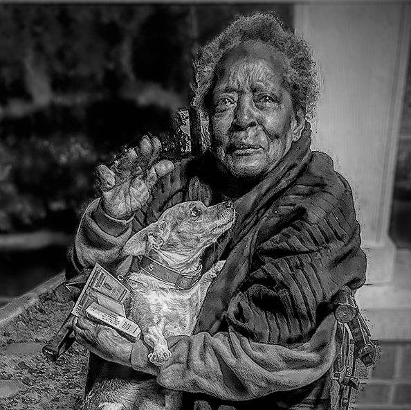 What a powerful image. I think this is one of your best. Just to satisfy my own curiosity, I converted to monochrome using a Topaz Studio 2 filter. I cropped even more than you and reduced the highlights on the dog to balance the emotions. I also used the "select subject" mask and inverted it to slightly blur the background. There are always little things we can change on an image. We can play all day but in the end, this is a remarkably emotional image that tells a wonderful story. Wow! Just wow. |
