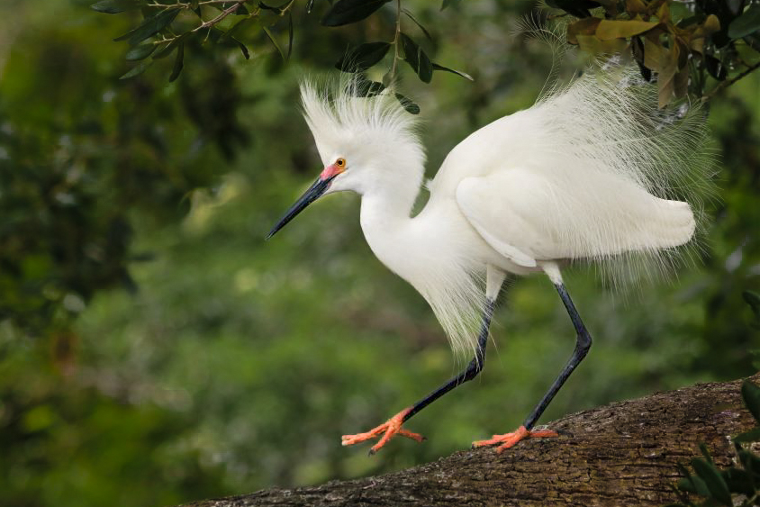 I think you have a wonderful image, properly exposed (hard to do with all white birds), and sharp. I like that you gave it space to move into. To my eye the color is a bit dull. That may be a function of the white balanced used in post. I think you had just a bit too much room for the egret to move into in that it doesn't appear to be moving very fast. My rule of thumb is at least twice the space it is moving into as it is moving from, depending on perceived speed. For me, the extra space throws the image out of balance. One way to make a white bird more brilliant without blowing out the whites is to trick the eye by making the background or dominate terrain darker. I did that and then I also like to use natural surroundings to form a vignette. I did that with the overhead branch and by darkening the base limb the egret is walking on. I did boost the whites a little but with the highlights in mind to help keep detail. I also used the Lightroom content aware tool to remove the leaves on the back of the egret. It's been said many times that if you don't get the eye you missed the shot. Just to make sure, I added highlight and color to the iris. I also lightened the feet a bit using the selective brush. Overall, a bunch of knit-picky changes to a very beautiful image. Well done. |