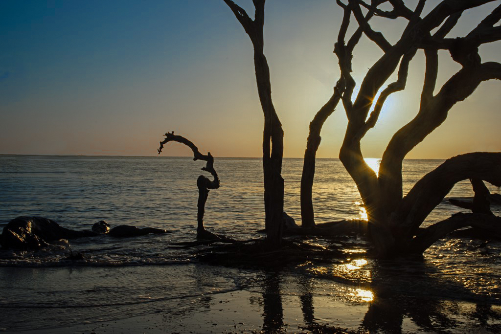 I liked the leading diagonal lines up the beach and to the horizon. I cropped out the majority of the sun because I felt it overwhelmed the coolness and serenity of the story. The dogs and person added the perspective a wide shot like this needs. Very nice. |