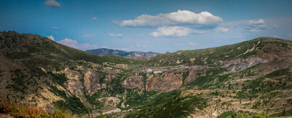 I really like the mountainous area in the background, as well as the color of the sky with the clouds. I think if the land in the foreground had been covered with flowers rather than having the light sandy areas that draw your eye there, it might work better. I tried cropping most of that area out, just to see how the mountainous scene would look. I think more flowers right along the bottom might add a nice contrast of colors. |