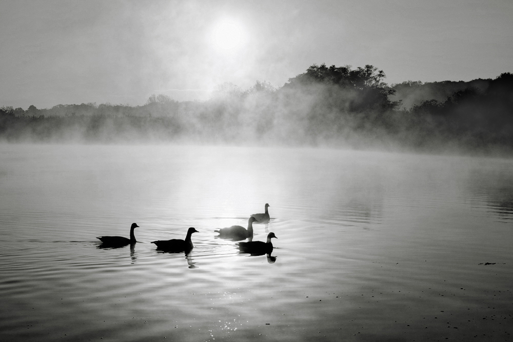 As Stephen says the original image is already monochromatic and interesting. The vignetting of the image I think tends to make it too flat, for my taste too range of grays and zero black, I understand that the morning mist acts as a giant softbox eliminating hard blacks. But with a sun so low, the ducks ask me for some black |