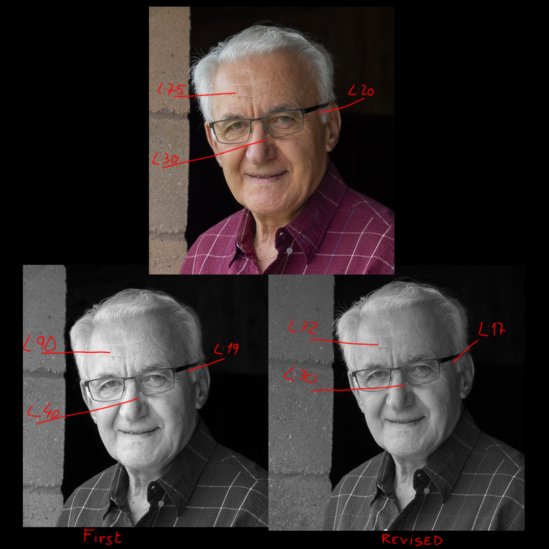 Is not too bright, the first conversion to black and white if it had too much brightness in part of the face, measuring the luminosity values ​​you can see that this second conversion to black and white is balanced as the original in the levels of brightness. Maybe the first time you just needed to lower something in the bright area of ​​the forehead |