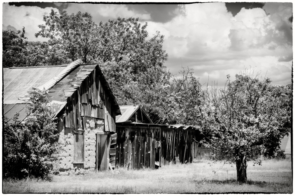 I really like the actual composition/scene, so applied one of my edits: though not as "creative" as yours, I am offering an alternative (less edited) version, that is reminiscent of traditional dark room alterations: adjusting color photo, including Dodging the Barn; Color Efex-Pro4 added custom ND filter. BW includes (lowering structure), yes, lowering, and applying an Orange filter. Adding slight Vignetting and a frame, that looks just like the edge of film.