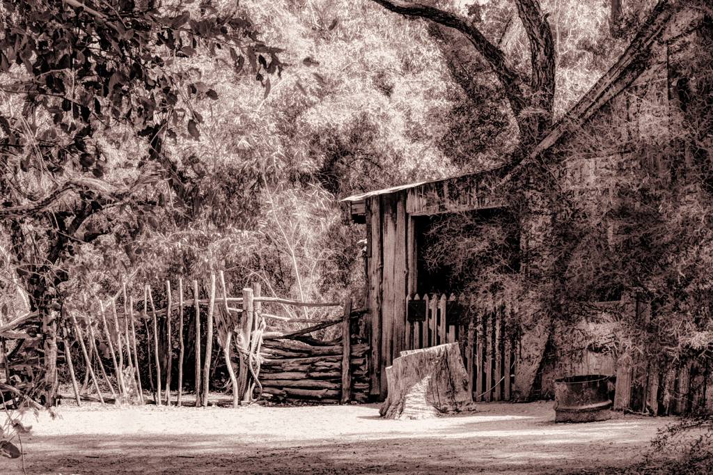 Right off the bat, this subject is perfect for BW rendering, and in this case trying to capture both the intricacies of texture in the different types of wood and foliage, along with hopefully to suggest a nostalgic or in this case, a (slightly) dreamy narrative, the subject is well chosen.
