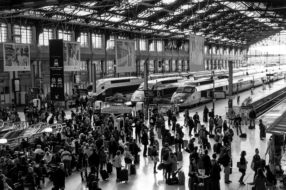 Though Mr. Levitas suggest viable options - I feel we do not want to crop this scene as your frame (likely seen through the viewfinder) allows the viewer the full breadth and scope of the location: you have successfully given the viewer a sense of "place" and grandeur at Gare de Lyon train station, in Paris.