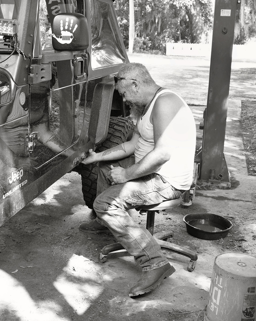 Your Main photograph is a well detailed photograph that reveals a lot of natural "grit" - and I like that. Also, I love the reflection of Dennis in the Jeep door - it adds incredible amount of interest, indeed. The background is limited, but I like the out of focus light & shadow. The piece is well conceived and executed!