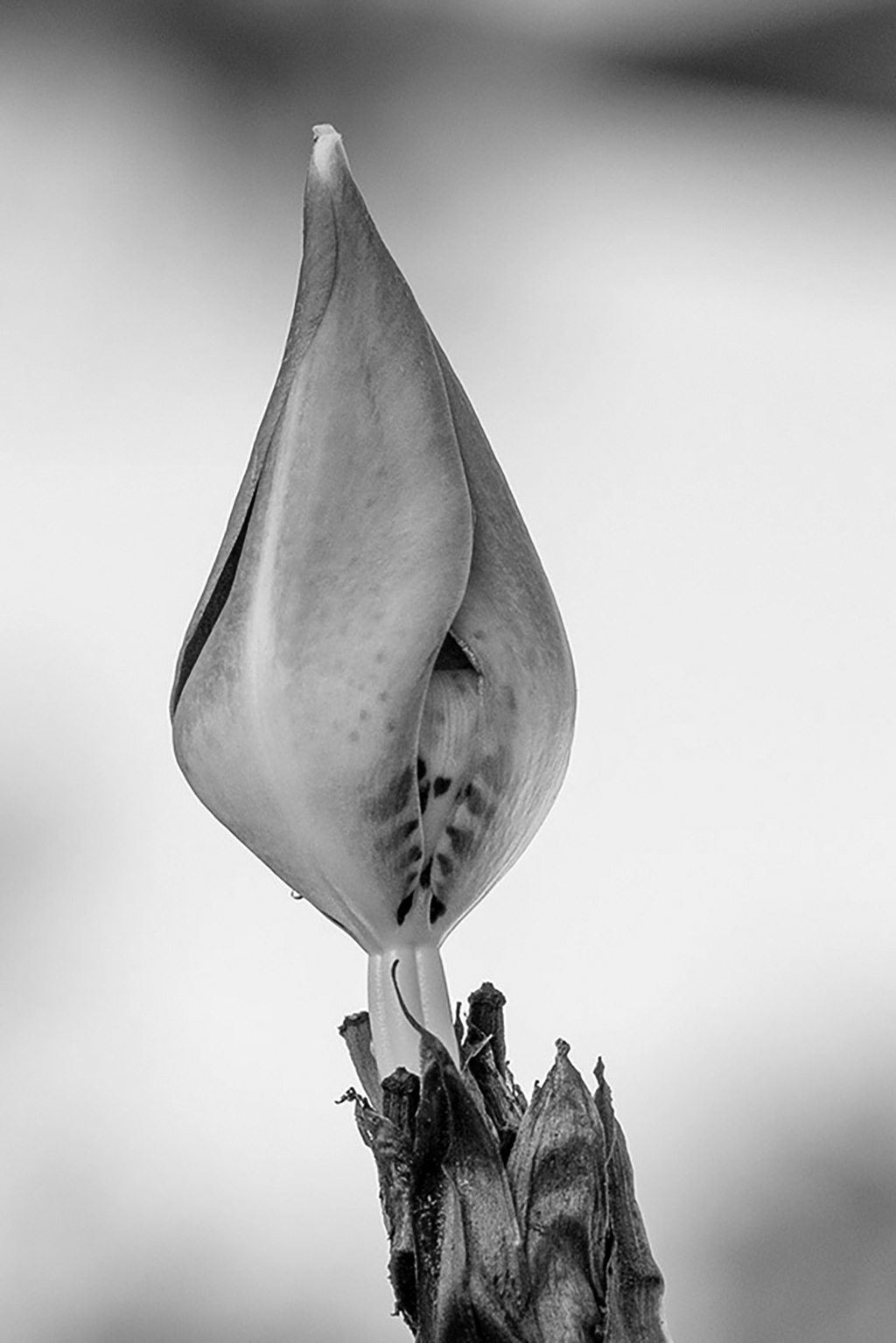 But, back to the off-axis original: in my opinion, and within a BW aesthetic, I feel the entire stem and bud are engaging components and offer their natural (un-manipulated) aesthetic. I took the liberty to quickly re-crop and add (minimum) processing for an example of what I am seeing in your subjects natural state.