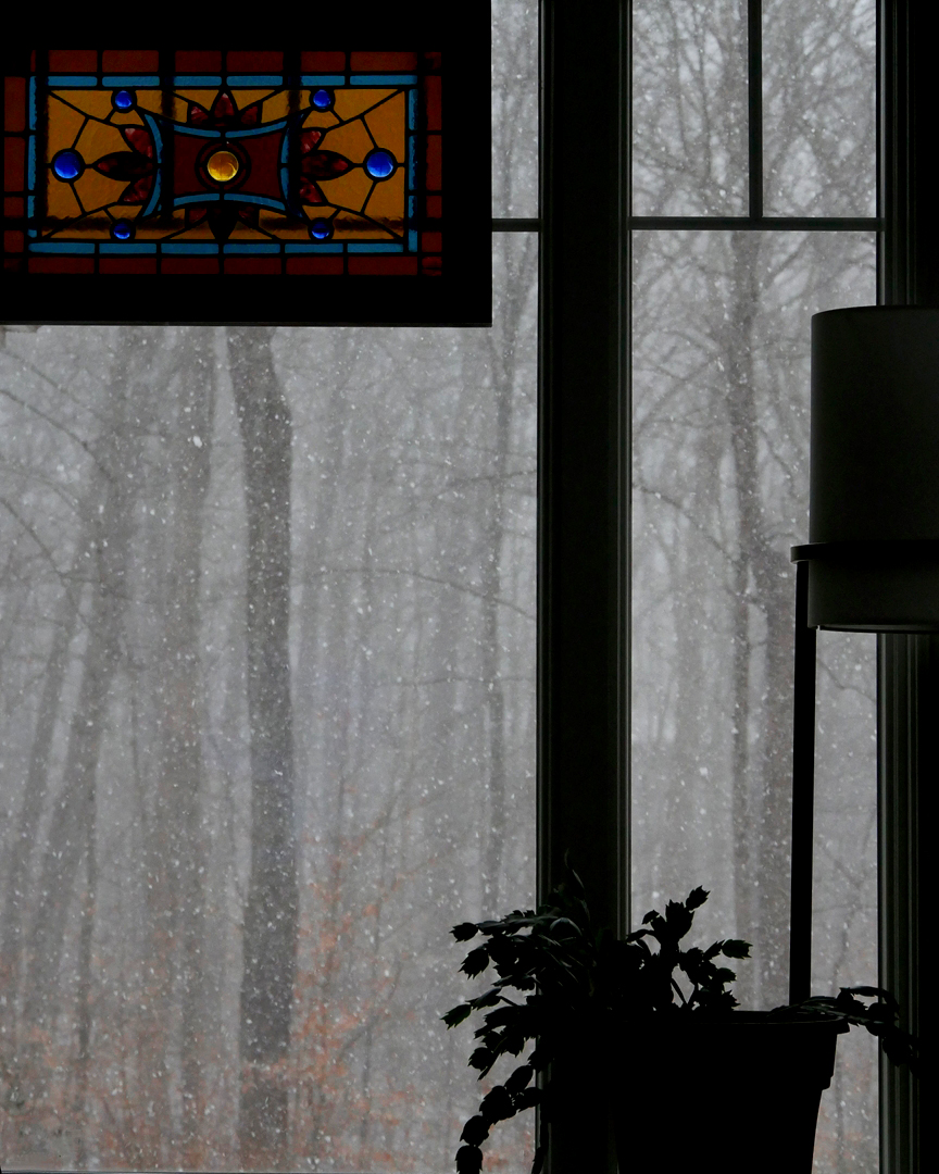 The only edit I thought enhanced the composition was to ever so slightly increase exposure and induce contrast: the subtle, softness of the backyard trees (by virtue of the falling snow) is still maintained, but I thought bringing more prominance between the stained glass and colored tree limbs was important. I look forward to your feedback.