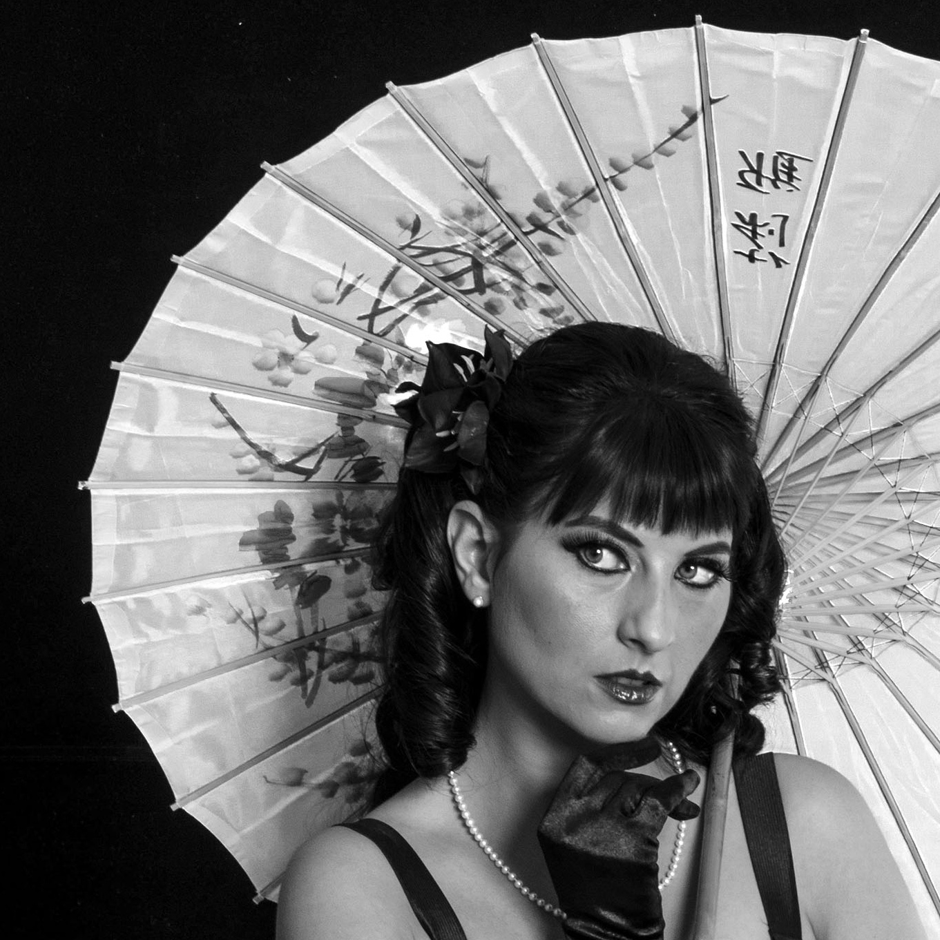 If you do not mind, I keep focusing on the models face and her gaze to her right: see my alternative crop that brings her beauty front and center, while I off-set the umbrella: the left-side black balances the models hair and eyes, the white umbrella acting as a supporting visual structure.