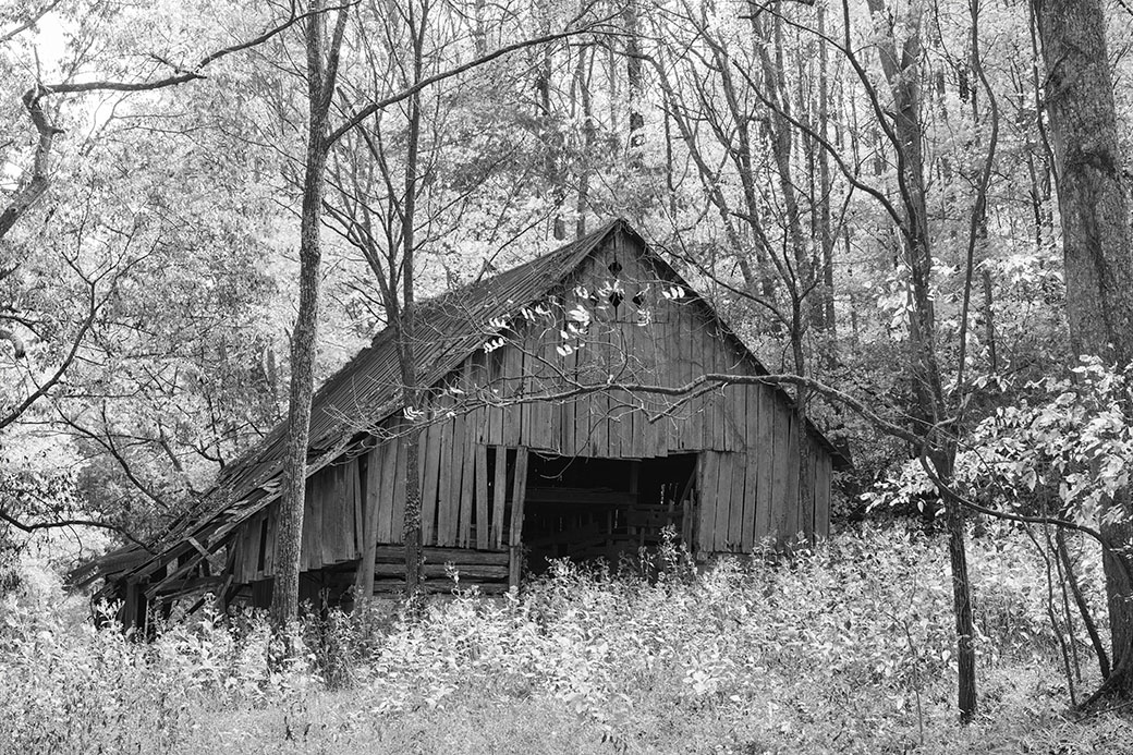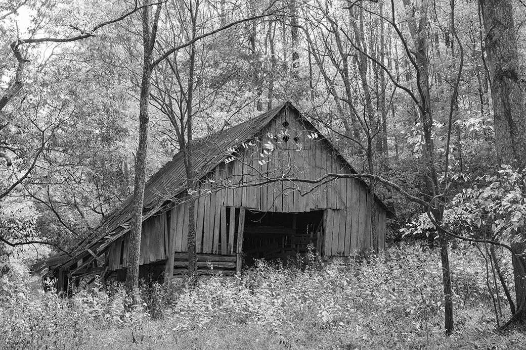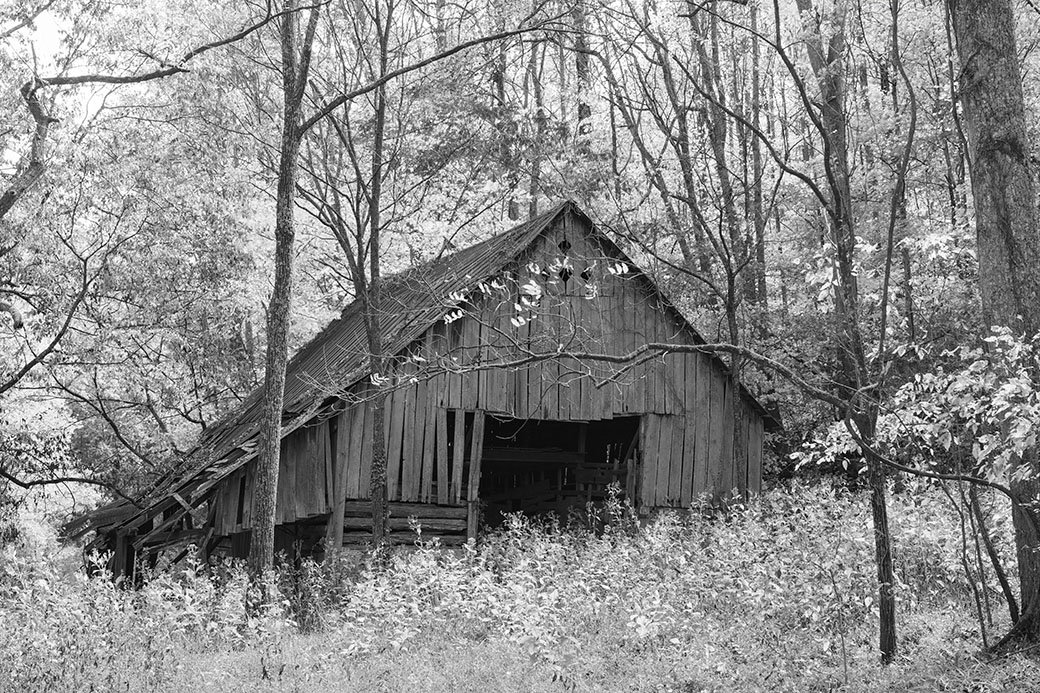 I worked the scene for about 15min standing in the middle of a 4-way intersection; being in rural TN, maybe two vehicles interrupted me during this time. Though the branch was immediately visible (from this position and a few others) I began to look at it as a means for balance and knew the leaves would add a contrasting spray against the barn. |