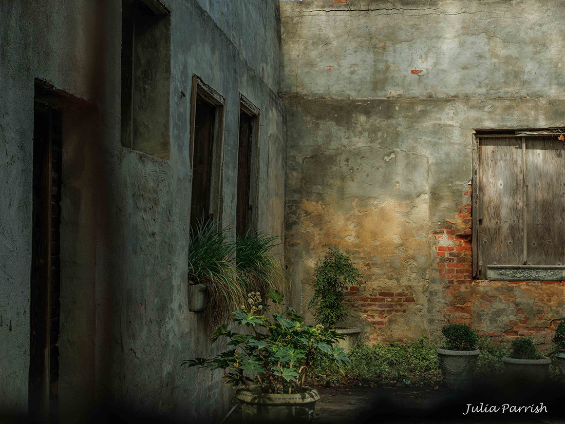 The space is calming, natural and very much illustrates a particular vernacular in this part of SC. The foreground plant is perfect and very much sits comfortable with the other plants and artifacts (e.g., weathered walls, sunlight, and the variety of textures). The image would do well (perhaps better) within a series of like images on Abandoned structures, for example. Well visualized and registered.