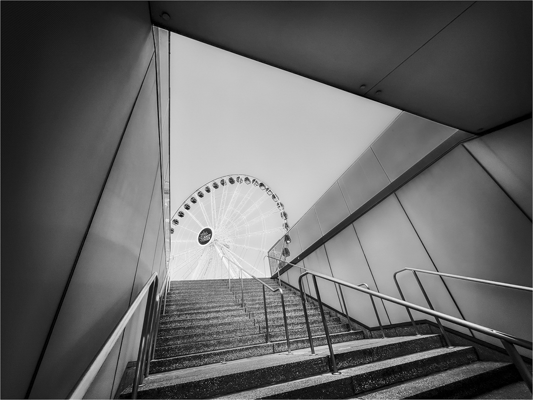 We may interpret the image to suggest the Ferris Wheel is supported by the salient features defined between the steps, wall and ceiling. In this case, though the Ferris Wheel is the main subject, it is not prominent within the frame: an important design feature I often speak/teach in my lectures. A feature we often see in some of Henri Cartier-Bresson work.