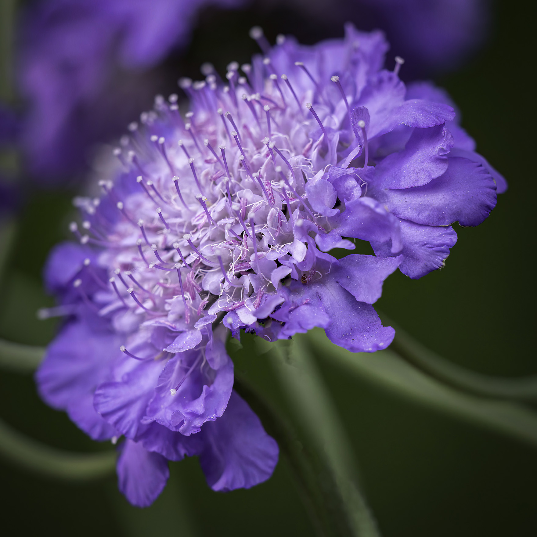 I especially like the focused details in the center-bottom of the flower, the surrounding lens Bokeh giving the image depth. However, I suggest, (also) the original image reveals, perhaps, an authentic representation some viewers may connect to, this in virtue of the stems "orientation" to the main subject. (I only suggest this as another way of presenting your work, and by no means the featured image is anything less).