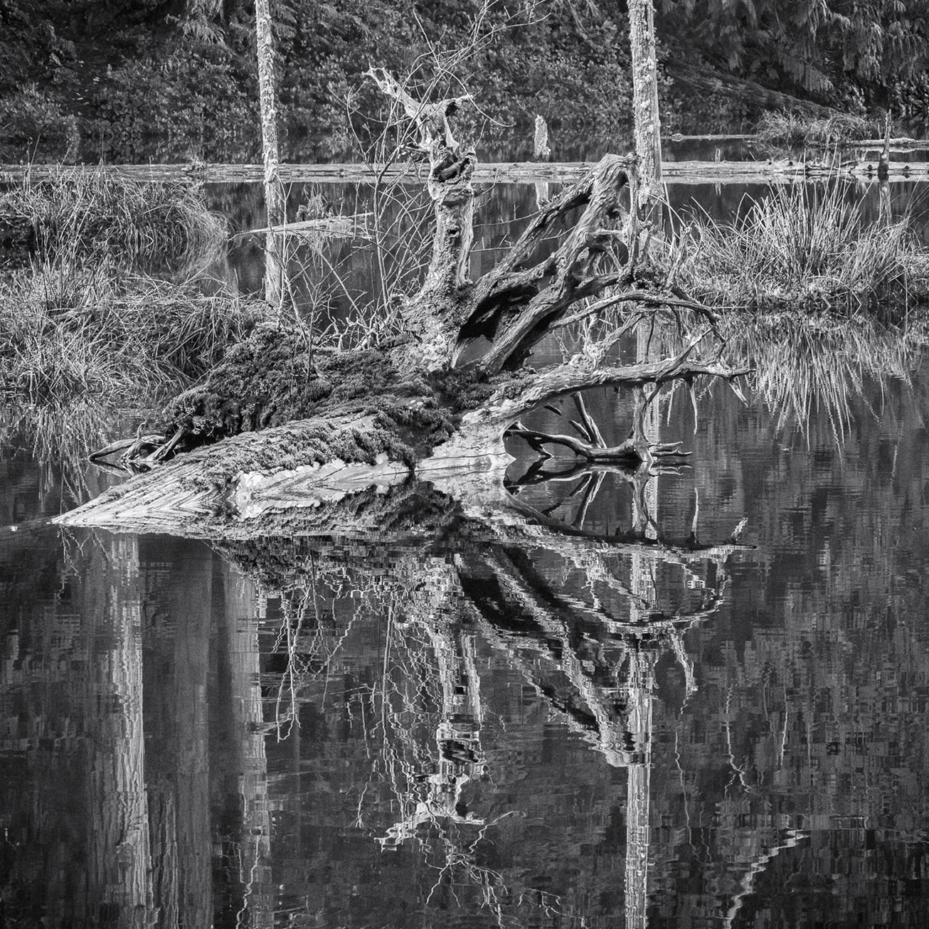 In fact, I suggest, (it) is key in presenting a perspective we do not often enjoy in both reality and the visual arts. In addition, because of the surrounding (very busy) foliage, I feel the centered trunk stabilizes the composition. (I have done similar work within my Intimate with Nature series of images).