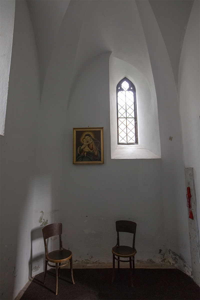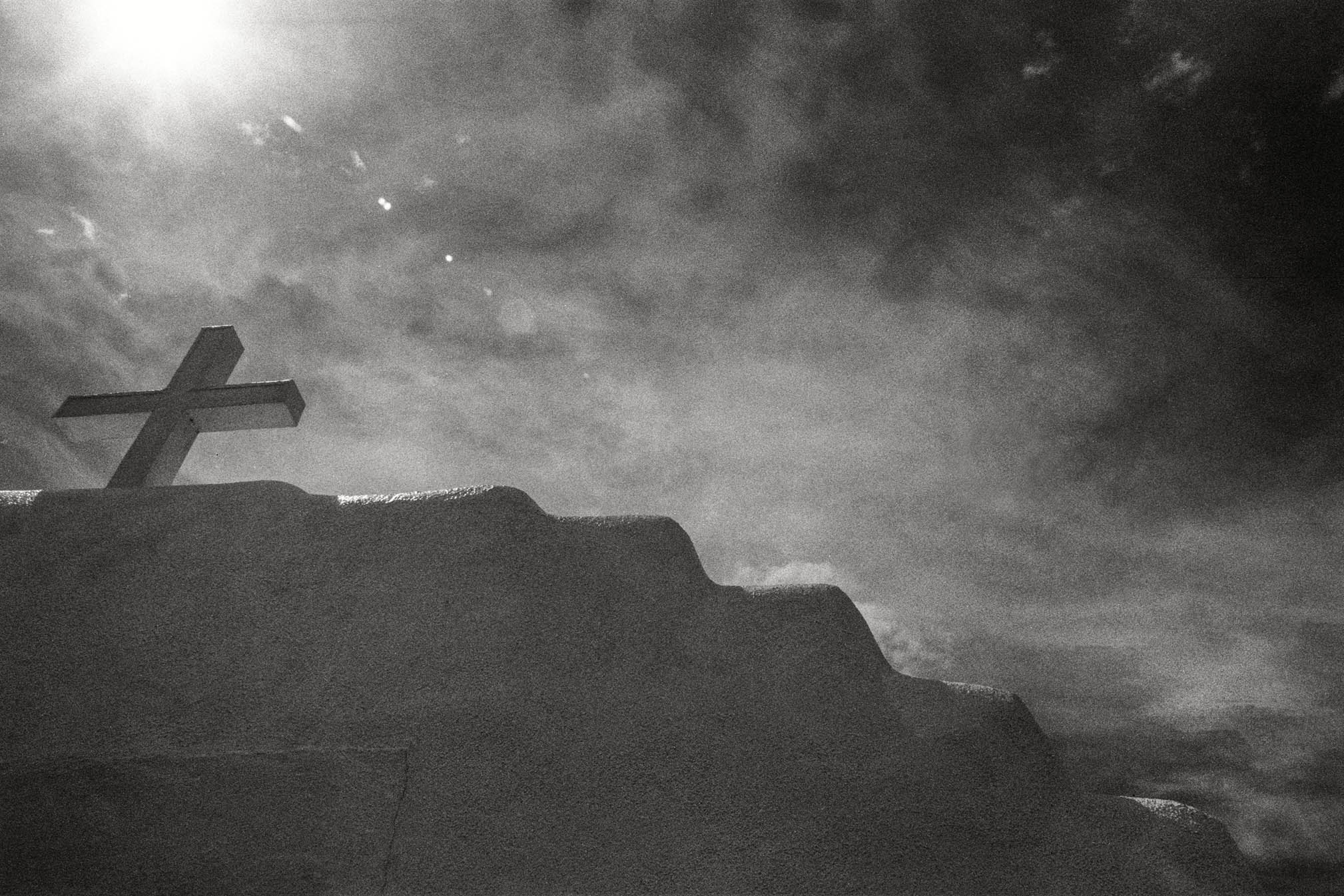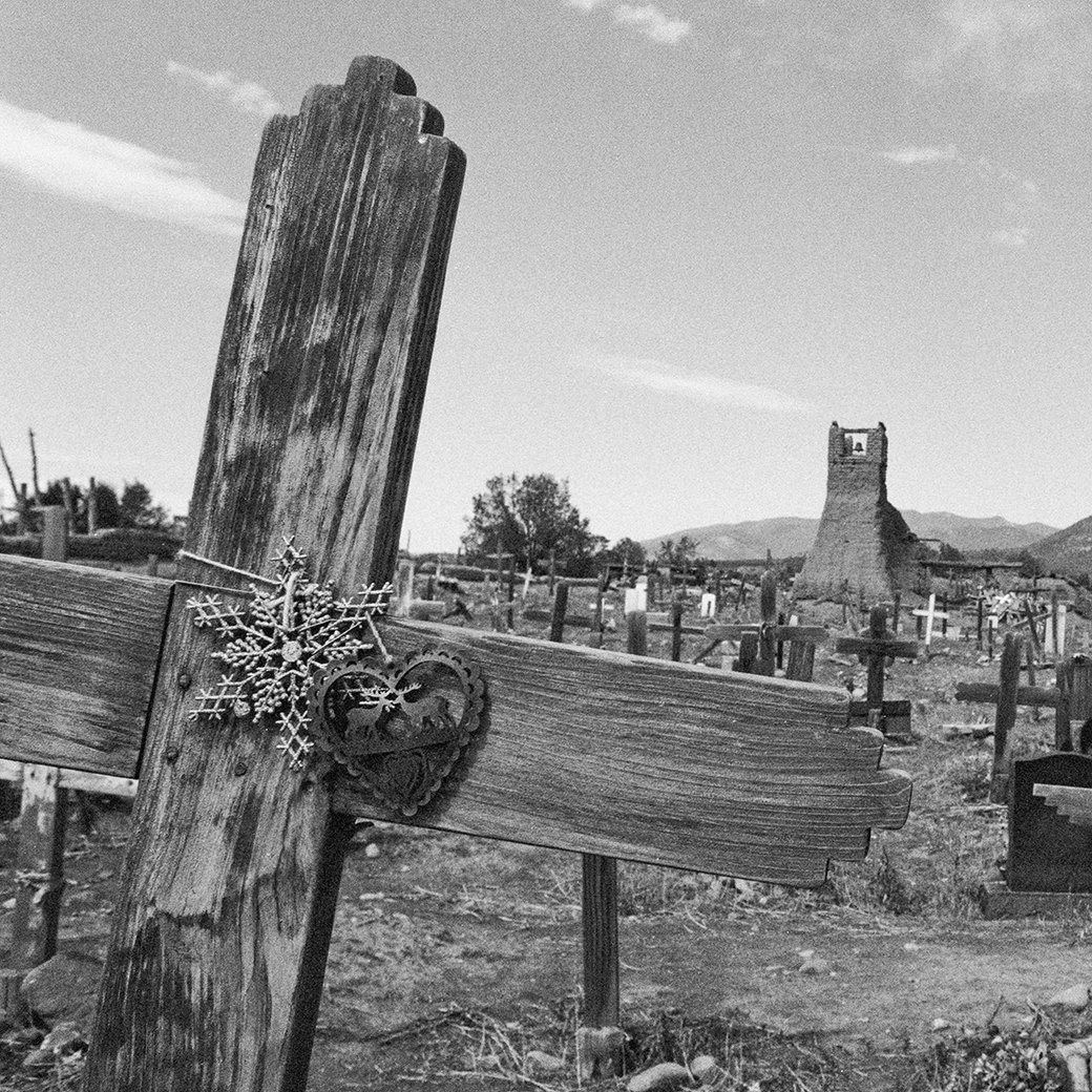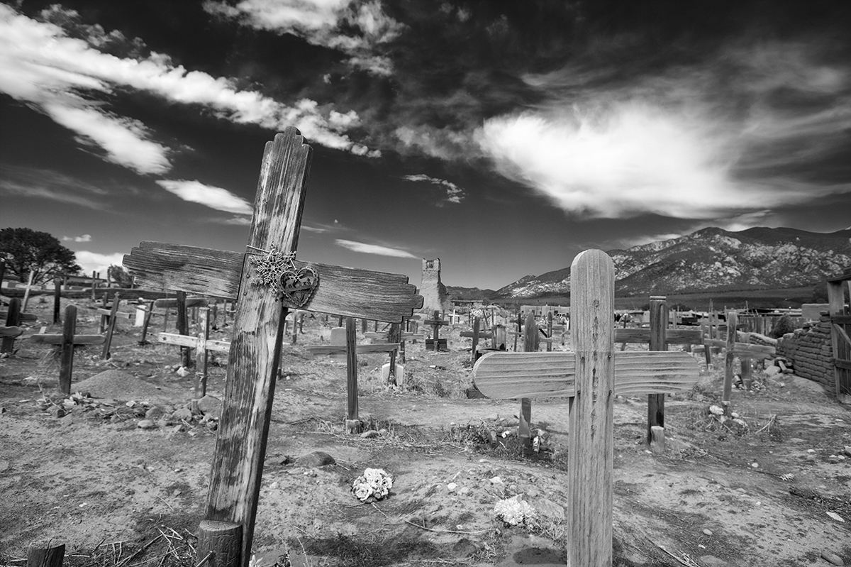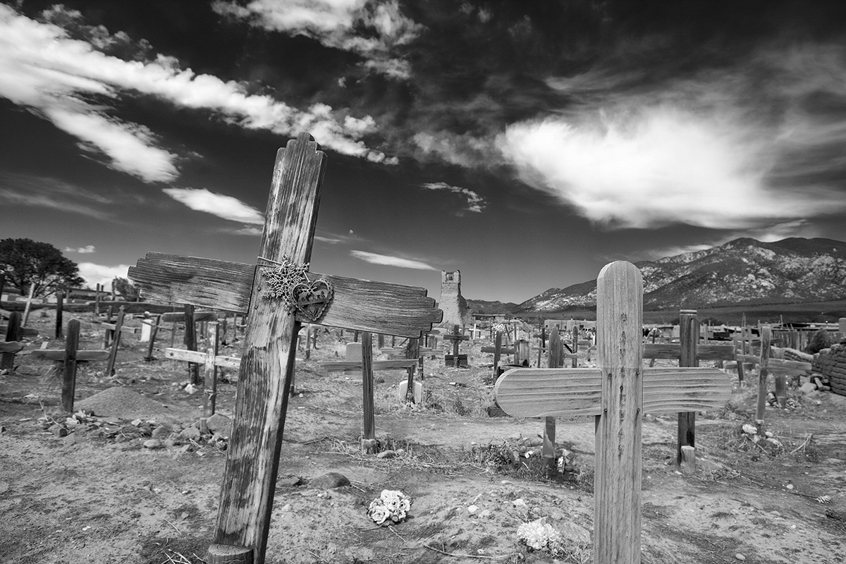 Indeed, composing the scene with a larger aperture (like one of Bob's examples) is viable, but then we lose identification of the space, which in this case is pivotal in the works documentary narrative: that is, letting the viewer know this is the sacred/spiritual grounds of Taos Pueblo, a well known and often studied community by both 20th century artist painters and photographers.