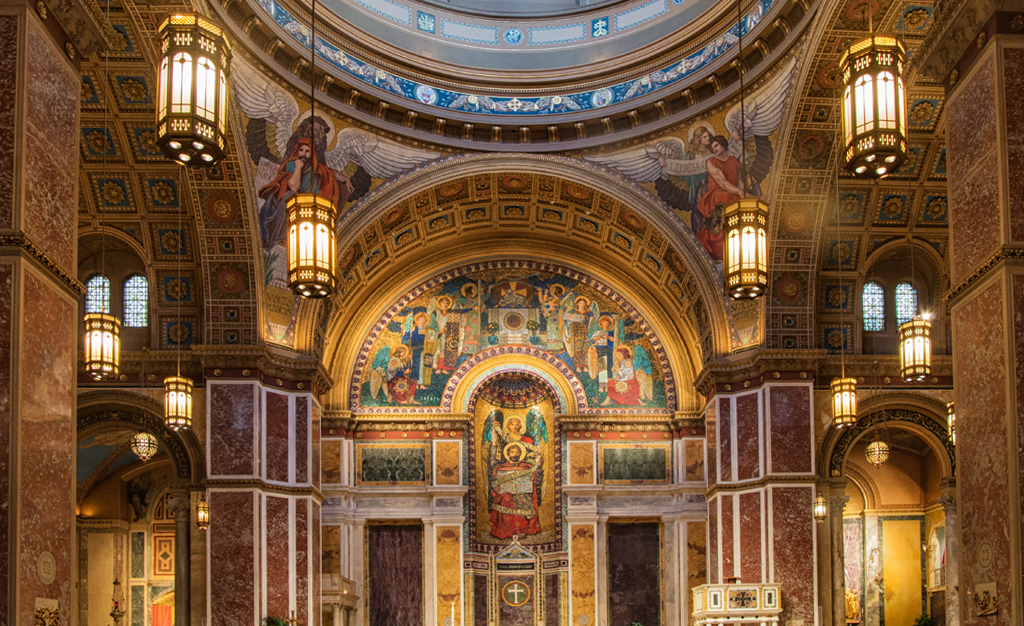 Another beautiful shot from you. As I looked at this it seemed like the rectangular pillars at the sides seemed to slant in at the bottom even though they were straight with the edge of your photo. (I'm just probably crazy) However I tried selecting the whole photo and skewing the bottom edges and to me the whole cathedral looks straighter. I also used the burn tool a bit on the people paintings in the front. |