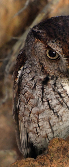 Very nice catch. Owls do look stern. Kind of makes me giggle. Good job. Half of him make for kind of a fun image too. :-) |