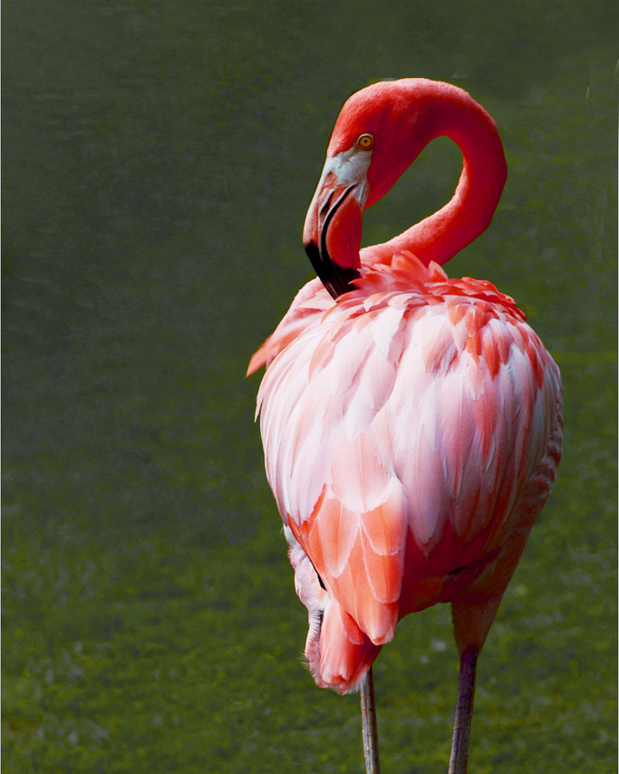 Great capture of the flamingo itself. I think the saturated green background is just too much and detracts from the flamingo itself. Also I think that the leg crop is in an awkward place. If the feet aren't going to show, it looks better to me if most of the legs don't snow either. I desaturated the green background and added a little background above the flamingo's head. |